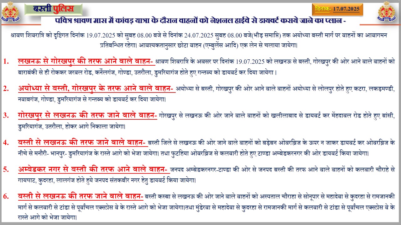 श्रावण शिवरात्रि को दृष्टिगत दिनांक 19.07.2025 को सुबह आठ बजे से दिनांक 24.07.2025 सुबह आठ बजे (भीड़ समाप्ति) तक बस्ती शहर के भीड़भाड़ मार्गों पर वाहनों का आवागमन प्रतिबन्धित रहेगा।