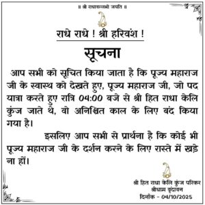 वृंदावन स्थित श्री कृष्ण शरणम् सोसायटी स्थित अपने आवास से श्री हित राधा केलि कुंज आश्रम तक प्रेमानंद महाराज जी की रात्रि दो बजे से प्रतिदिन होने वाली पदयात्रा को उनके स्वास्थ्य कारणों के वजह से स्थगित कर दिया गया है।