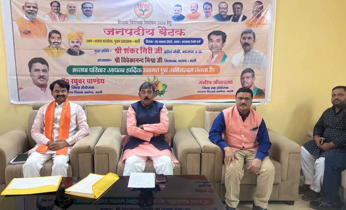 शिक्षक विधायक निर्वाचन 2026 की तैयारी को सुचारू गति देने के उद्देश्य से बुधवार को भारतीय जनता पार्टी कार्यालय बस्ती में जनपदीय बैठक का आयोजन किया गया। बैठक की अध्यक्षता जिलाध्यक्ष भाजपा विवेकानंद मिश्र एवं मुख्य अतिथि के रूप में शिक्षक विधायक निर्वाचन अभियान के प्रदेश सहसंयोजक तथा भाजपा के प्रदेश मंत्री शंकर गिरी मौजूद रहे।