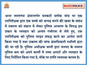रविवार की शाम करीब साढ़े चार बजे लालगंज थाना थाने में तैनात एक दारोगा द्वारा बनकटी ब्लाक मुख्यालय के थाना मोड़ पर स्थित एक गन्ने का जूस पेरने वाले किशोर को मोटरसाइकिल पर पान का छींटा पड़ने की वजह से थप्पड़ मारने एवं उसी किशोर द्वारा कपड़े से अपनी मोटरसाइकिल पोंछवाने के मामले को पुलिस अधीक्षक डॉ. यशवीर सिंह द्वारा संज्ञान में लेते हुए, लालगंज थाने में तैनात उप निरीक्षक शैलेंद्र सिंह को तत्काल प्रभाव से लाइन हाजिर कर दिया है।