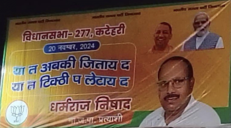 प्राप्त जानकारी के अनुसार अंबेडकर नगर के 277 कटेहरी विधानसभा क्षेत्र से भाजपा प्रत्याशी धर्मराज निषाद द्वारा एक होर्डिंग लगवाया गया है, जिसमें अवधी भाषा में लिखा गया है “या त अबकी जिताय द, या त टिक्ठी प लेटाय द”। जिसको मतदाता खूब चटखारे लेकर पढ़ रहे हैं। उक्त होर्डिंग पर कमल के फूल के निशान के साथ-साथ, प्रधानमंत्री नरेंद्र मोदी एवं उत्तर प्रदेश के मुख्यमंत्री योगी आदित्यनाथ की भी तस्वीर लगी हुई है।